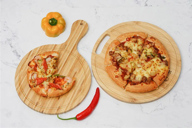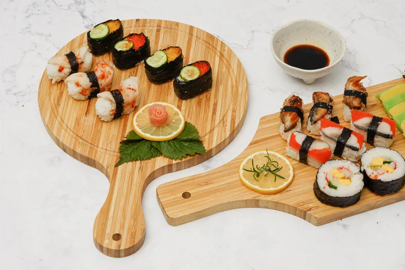 Thớt tre hình tròn có thiết kế tay cầm tiện lợi mang tính thẩm mỹ cao, giúp người dùng có thể trang trí thức ăn đẹp mắt. Người dùng có thể tự do lựa chọn nhiều cách trang trí thức ăn với thớt trong các bữa tiệc.